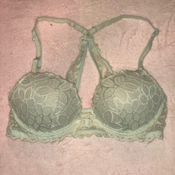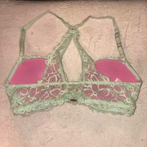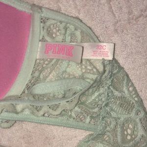 Light blue, front clasp and cross/fancy lace back PINK bra. Excellent condition. Only worn twice