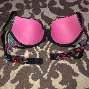 This is a fun colored bra from Pink! It has the logo written all over it in a variety of different colors!