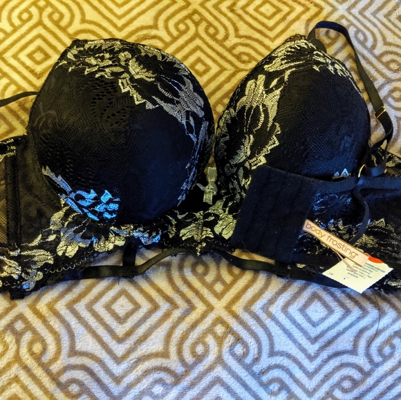 Beautiful Lacy push up bra. colors intertwined with the black are silver. Was purchased from a Lingerie party. Just never wore it