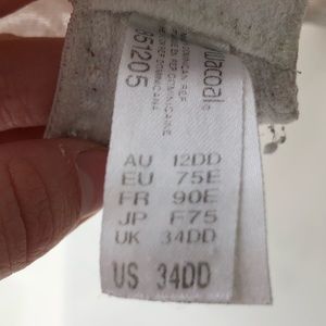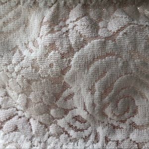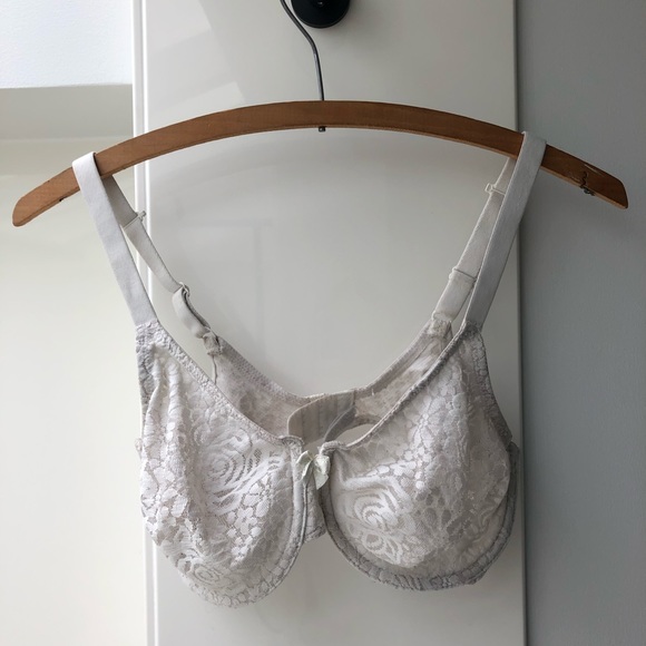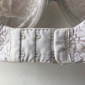 White lace bra with underwire and no cups/padding. Great support but still comfy! Three hook options in the back, adjustable wide straps, and racer back option.