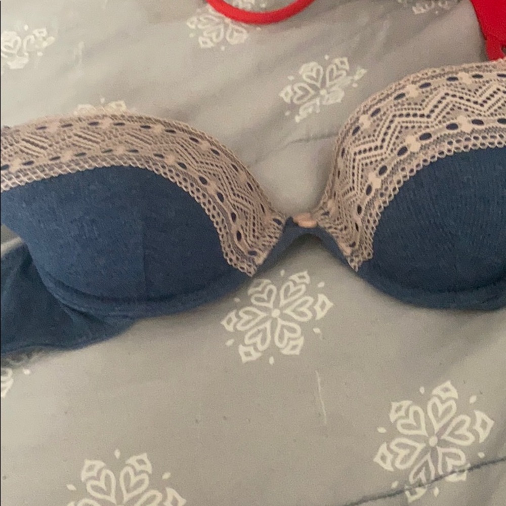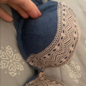 Blue and pink lace bra
