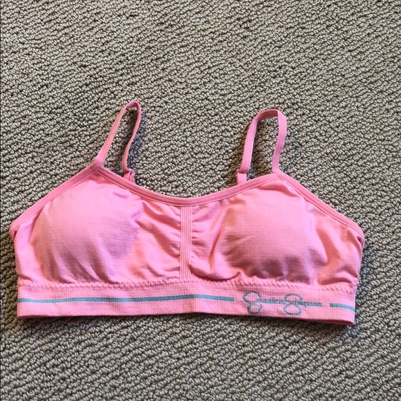 It is pink with the teal line around the elastic band on the bottom. It has adjustable bra straps on the back. Never been worn!