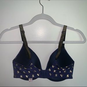 Navy blue with gold logo, shiny gold straps, lightly lined T-shirt bra