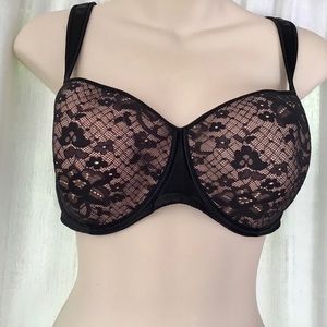 European made, full coverage seamless cup bra. Beautiful satin body with tan covered black lace cups. Like new!!