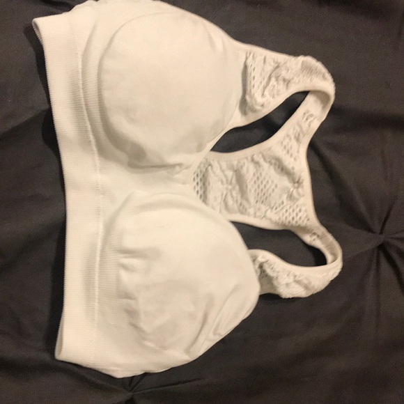 White, low impact, tshirt sports bra. Removable pads