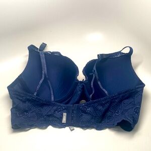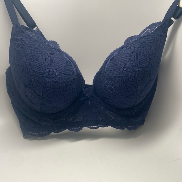 Aeire by American Eagle in navy blue lace bra. It’s under wired cups adding support and structure. It’s in mint condition, wore it once and realized I overestimated my “talents” by getting the “C” cup instead the “B”.