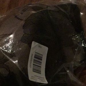 Black lace, lightly padded with underwire and elastic straps. Still in the sealed bag on its hanger. Never opened or worn.