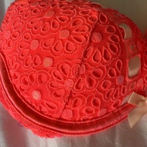 Neon pink with floral lace and sequins. Extra straps included