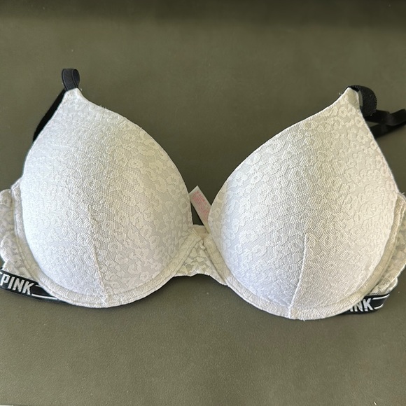 White, cheetah, lace push up bra. Shows some signs of wear/pilling but can be worn for a while.