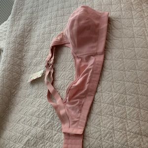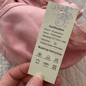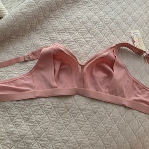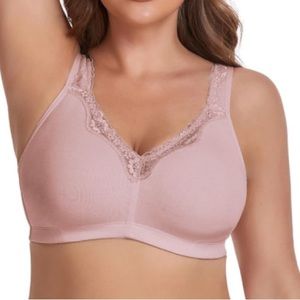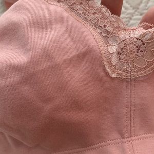 Soft tee shirt material with pretty lace detail. Lovely rose pink color. Wide comfortable band with four hooks and adjustable straps. 95% cotton. Wireless & Unlined… Definitely not an A cup though more like a B+. Brand new.