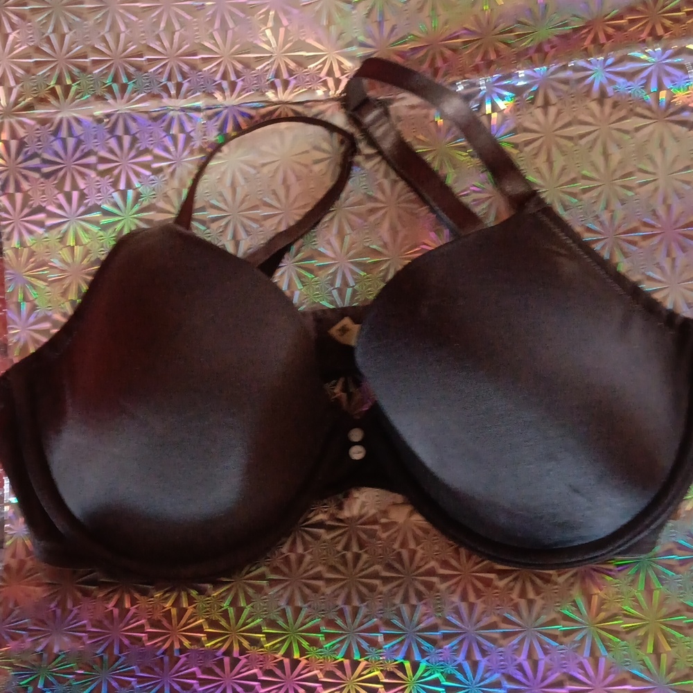Beautiful soft, foamlike, and shiny black underwire bra, with adjustable shiny straps, size 38C, with two-hook closure, with 2 pearlwhite decorative buttons, centrally located between the cups, in very good condition and simply sexy.