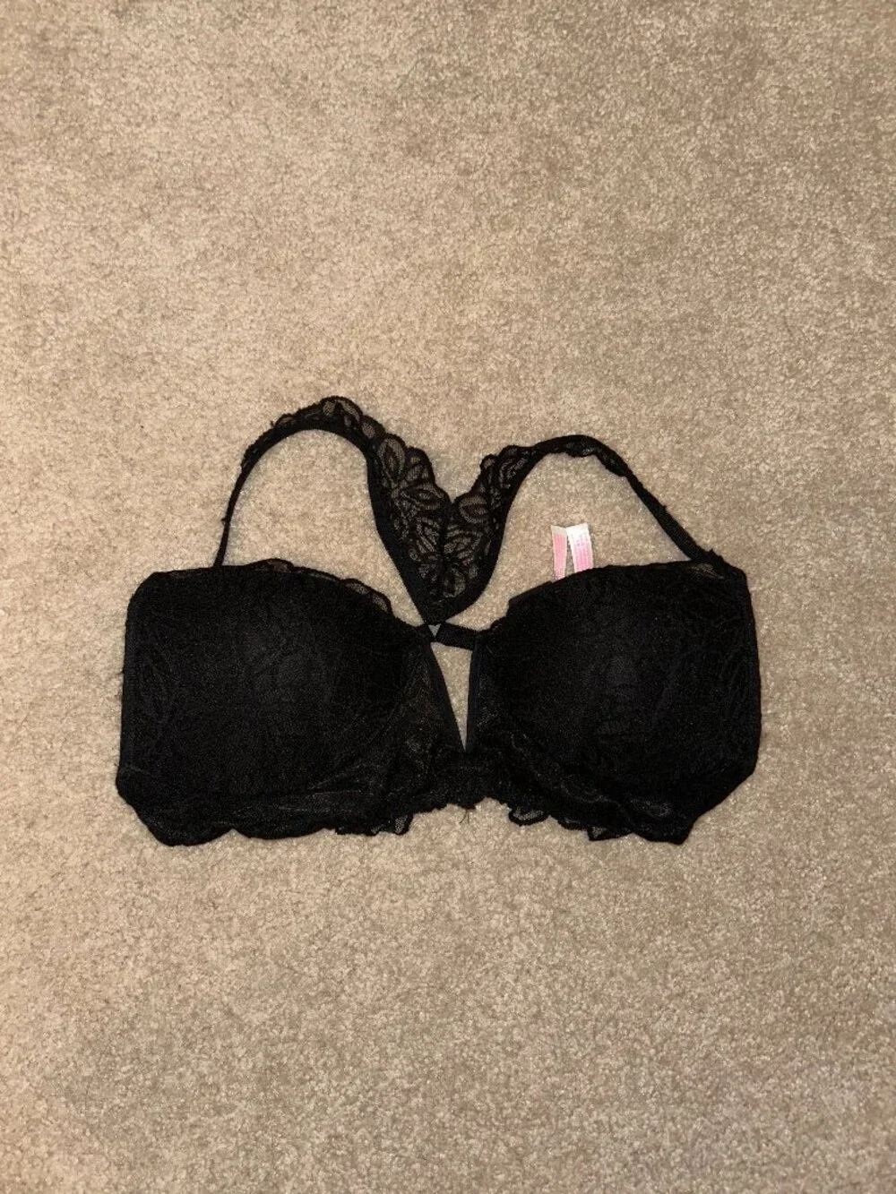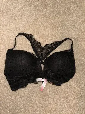 Victoria's Secret PINK black, lace, "Date Push Up" bra. Material is Body: 88% polyamide, 12% elastane; Back: 89% polyamide, 11% elastane; Cup lining: 100% polyester. Women's size medium.