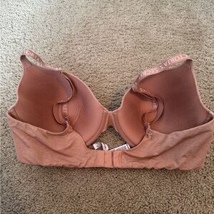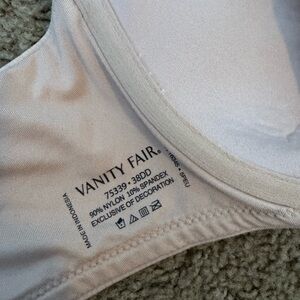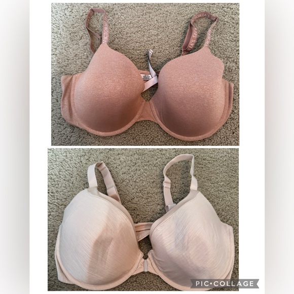 Both nude color bras. The lighter color has a front clasp and vanity fair brand. The other is Victoria secret. Both 38DD
