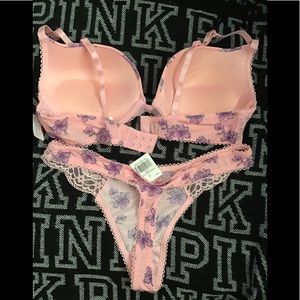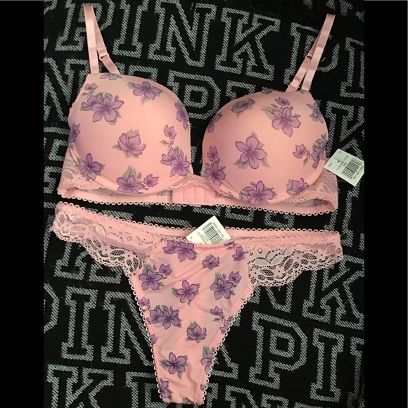The bra size is 36D but runs extremely small like B or C and it’s padded with wire has lace on the sides with flower print The thongs are size xl runs small fits like a large or medium has lace on the sides an flower print NEVER WORN NEVER TRIED ON Thanks for looking 😊