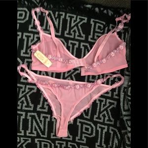 The bra is size 36C but runs extremely small like a B maybe C it’s pink sheer material with a wire purple detailing around it The thongs are pink sheer with the same purple detailing around it size Large probably can fit medium depending on how your shaped it’s cute a sexy Thanks for looking 😊