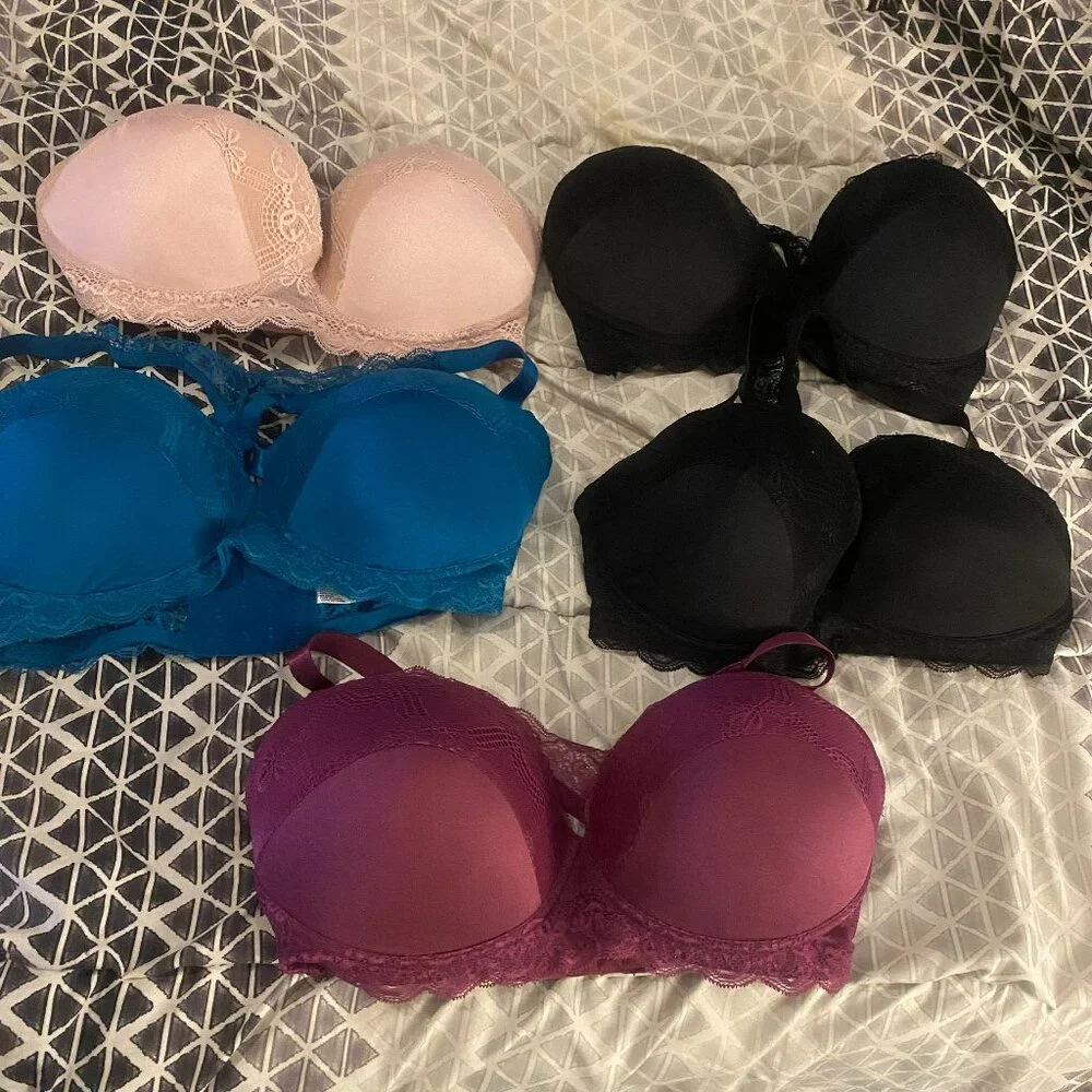 This is a set of bras one in a light pink, one in a turquoise color, one in a maroon color, and two black ones. They are size 34DD with a lace detail on the front and razorback style on the back. These are also padded.