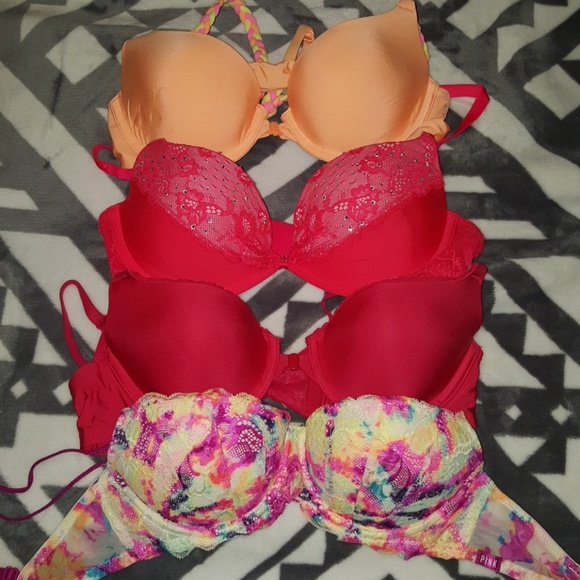 Selling bundle of gently used bras. All of these have literally been used maybe 2 times and have been gentle washed. The solid color ones are not push up but the other ones are push up. Red bra with stones tag has been cut off. Orange one is a braided t-back strap. All 32B