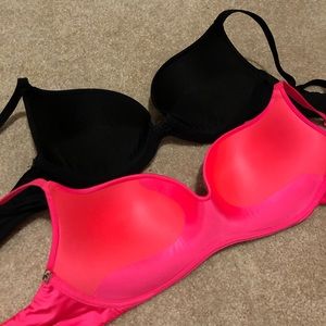 Pink bra is Victoria’s Secret, 32C. Black bra is GAP body, 32B. Both in excellent condition.
