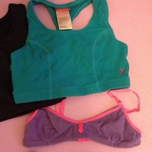 2 sport bras (blue and black) 2 Calvin Klein training bras (black and white) 1 purple and pink training bra 1 pink seamless bra
