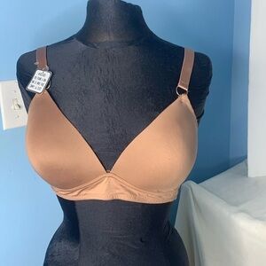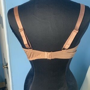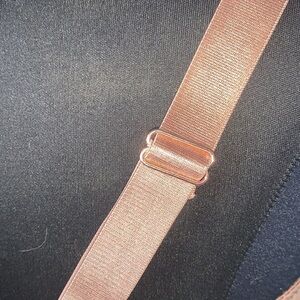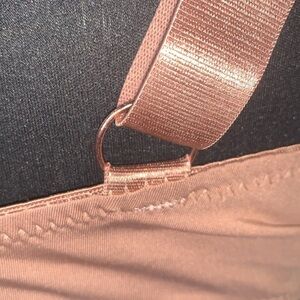 Beautiful bra and a shiny brown with rose gold rings for the shoulder strap and tightening mechanism on shoulder straps no wire wireless nothing too pinch or hurt your rib cage. Very comfortable nice material machine washable 90% polyester 10% elastic.