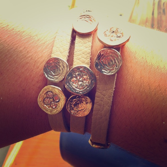 Beautiful wrap around bracket. Wraps three times and has two snaps for different sizes. Beige leather strap with gold, silver, and copper colored beads. I will hate to see this one go but the buyer will absolutely love it!
