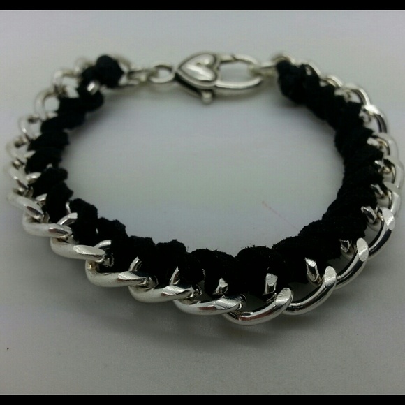 Black leather woven bracelet with heart latch