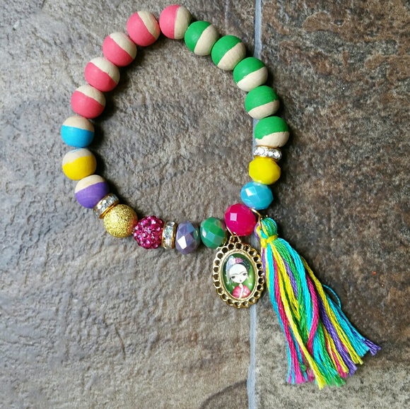 Frida bracelet stretchy material. .wood and crystal beads