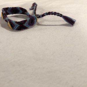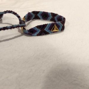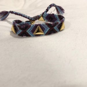 Purple and blue bracelet with three gold triangles and one gold triangle in the back