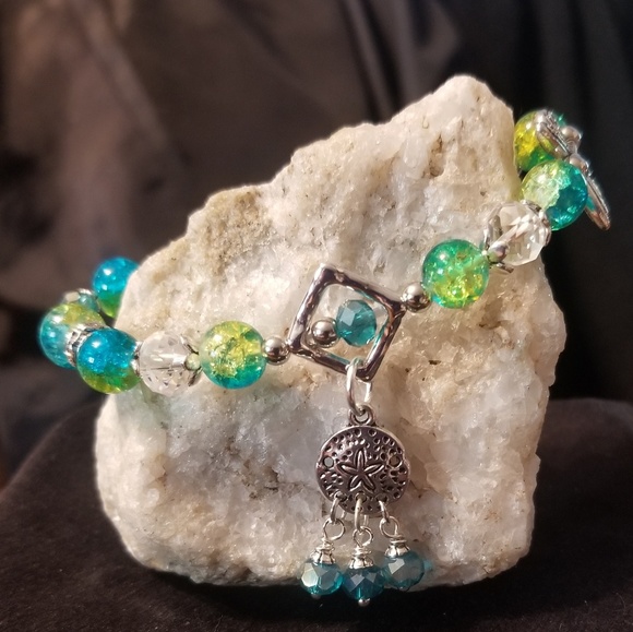 Handmade stretch bracelet with sand dollar charm and crystal dangle charms.