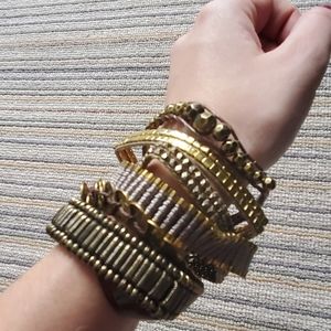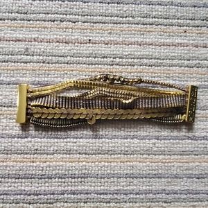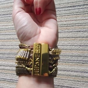 A layered Hipanema bracelet made from an eclectic mix of ribbons, beads, stones, and coins. It is really easy to close with the magnetic clasp. Beautiful browns and cold complete the bracelet.