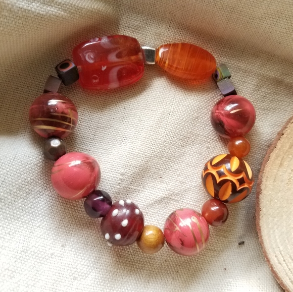 Vintage glass and stone beads, repurposed to make a unique statement bracelet. Strong stretch cording for ease and comfort.