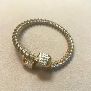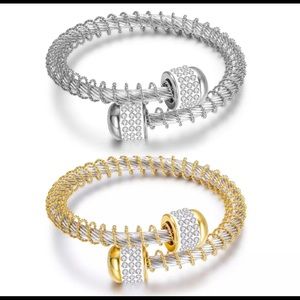 Stainless Steel adjustable wire bangle with pendants that have faux pave’ diamonds.