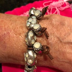 Stones and leather. Lovely pink velvet pouch included iridescent stones set in sterling silver with leather accent.