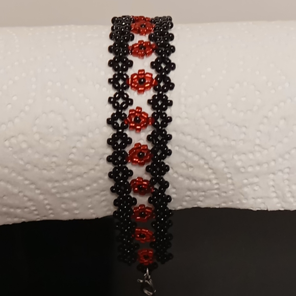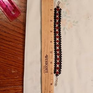 Black and transparent red seed beads. Lobster claw clasp. Adjustable chain. 8"