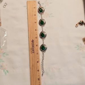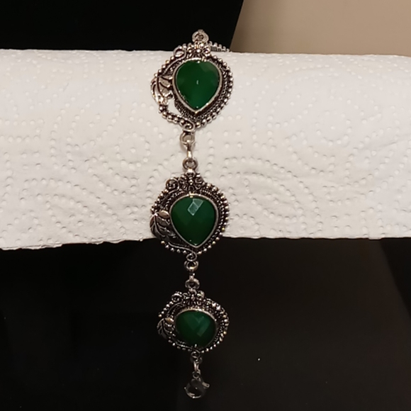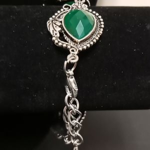 Green opal shape stone with silver leaf edge. 9 1/2" lobster claw clasp. Adjustable chain.