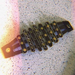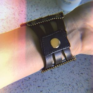 Beautiful synthetic leather bracelet with applications and snap clasp, color brown.