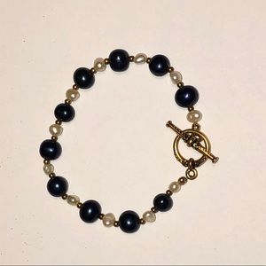 Classy styled bracelet with vintage gold toggle clasp. Navy blue, white, and gold breads.