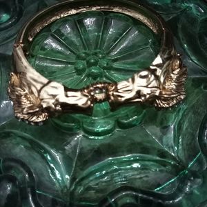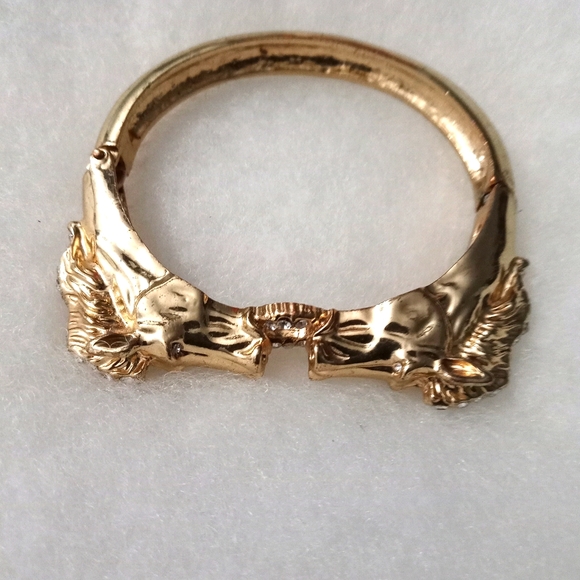 Double horses with spring hinge clasp. Gold No fussy pieces to connect or secure. Just skip on. I like this bracelet feature