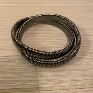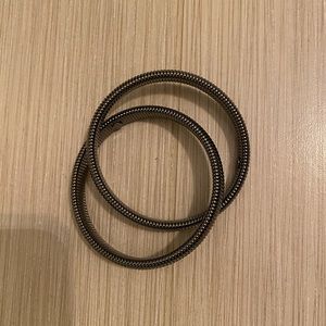 Two interconnected metal bracelets. Slip on over your wrist. No clasp.
