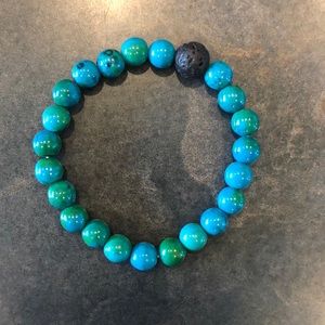 Blue green beads. One lava stone bead. Elastic stringer.