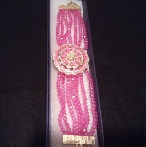 beaded hot pink bracelet with detachable broach. 7 to 9 inches.