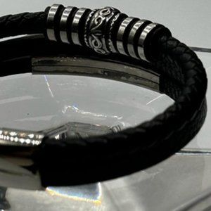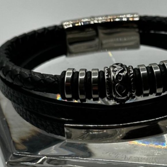 Bracelet with magnetic closure, simple line in black leather, line in black leather plus pendant and line in black intertwined leather plus pendant. Minimalist jewelry for men