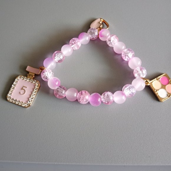 Pink bracelet with charm one size fits most acrylic beads hand made