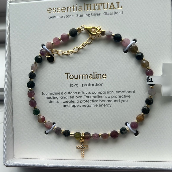 Brand new multi colored Tourmaline bracelet. Gold plated over Sterling Silver. Has a tiny cross with bling on it. It could be removed if you’re crafty. Has extender attached.