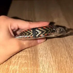 All black bracelet with silver triangles and orange on the ends
