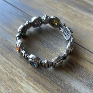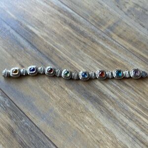 Silver tone with multi colored “stones”. Magnetic clasp makes it easy to put on and take off, but is still secure while wearing. 7” length.