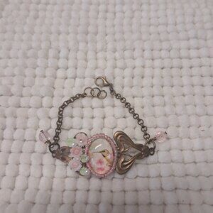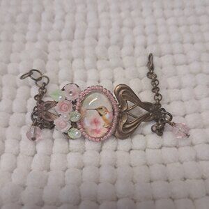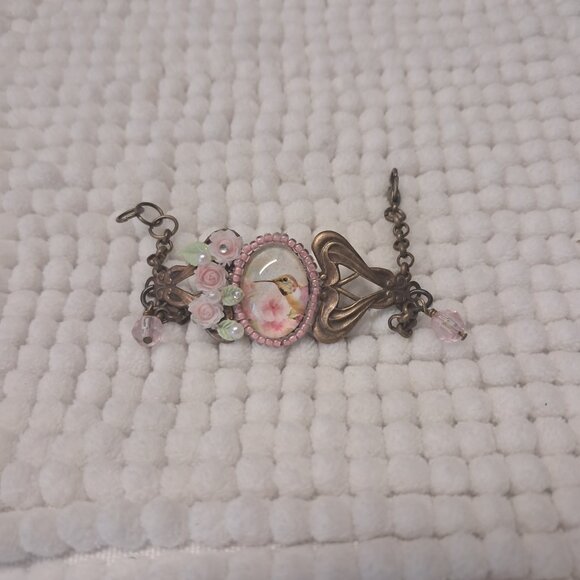 This is a vintage style brass hummingbird bracelet with floral accents. It's a size 7 but if you need it smaller or larger I can make those adjustments.
