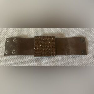Pave stones. Leather band has two sets of snaps for perfect fit. Great addition to your bracelet collection