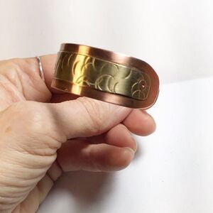 Hand Crafted Copper cuff is embellished with a hand hammered strip of brass, riveted at each end. This cuff is sealed on the outside to maintain its shine, and the inside of the cuff is raw copper to give you the “copper effect” that is being touted in so much sports advertising today. Adjustable from 6” to 7.5” wrist, 0.75” wide. Polishing pad for interior of cuff is included. New from my studio.