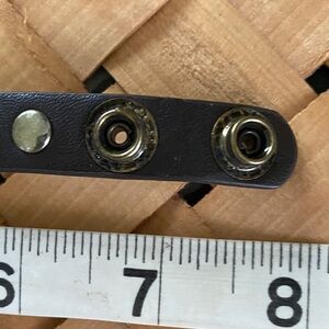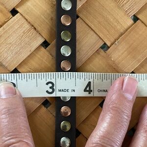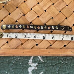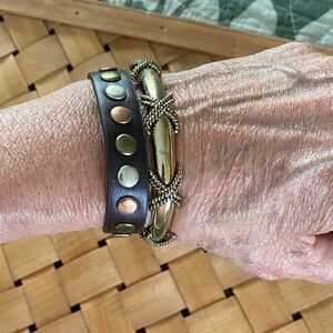 Gold stretch bracelet with crossed rope design. Brown bracelet with silver, gold and copper studs and two position snap closures.